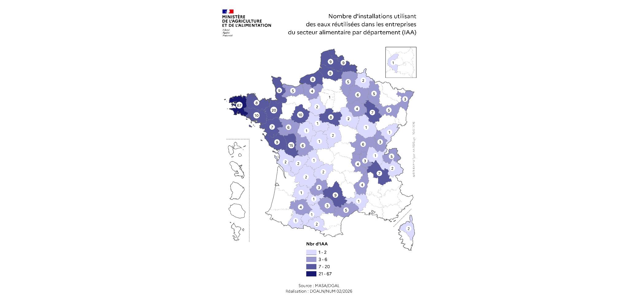 En France, la nouvelle réglementation en vigueur depuis janvier 2024 issue du plan Eau a permis à environ 340 entreprises agro-alimentaires de produire et d’utiliser des eaux non conventionnelles. La carte ci-dessous présente la répartition des sites de réutilisations d'ENC par département dans le secteur alimentaire :