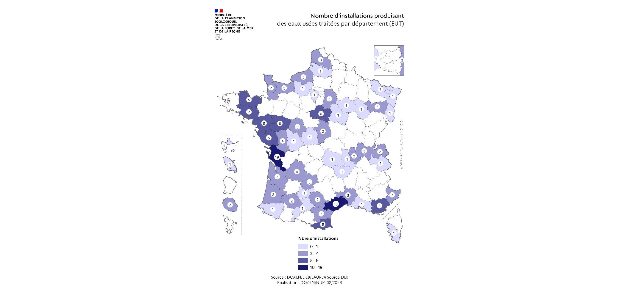 En décembre 2025, on recense ainsi près de 165 stations d’épuration (urbaines et industrielles) dont les eaux usées sont pour partie utilisées (voir la carte ci-après « Nombre d’installations produisant des eaux usées traitées par département »), contre 135 en 2023, soit un peu plus de 22% d'augmentation en deux ans :